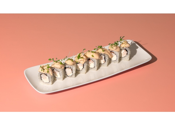 Krējuma siers, tīģergarneles, garneles, pikantā majonēzes mērce, rīsi, nori