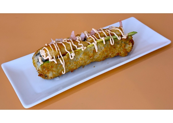 Tempura tīģergarneles, garneles, avokado, cheddar siers, rīsi, nori, tempura, mērce.