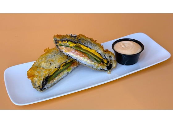 Lasis, cheddar siers, gurķis, aisberga salāti, rīsi, nori, tempura, mērce.