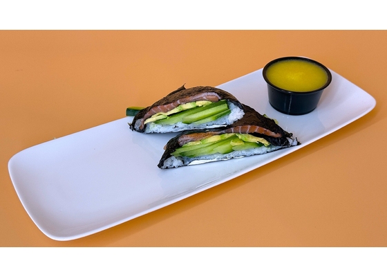 Lasis, avokado, rīsi, nori, krēmsiers, mērce.