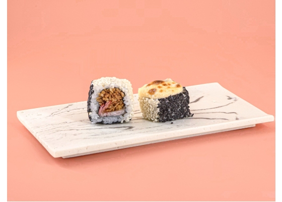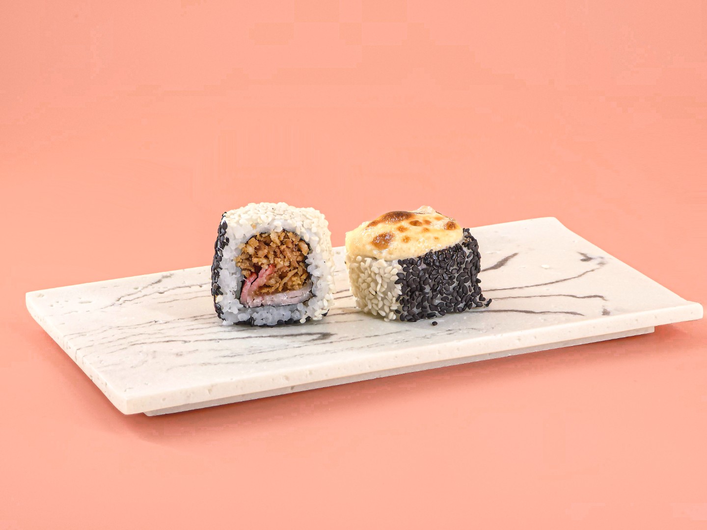 Bekons, ceptie sīpoli, sezama sēklas, masago, pikantā majonēzes mērce, rīsi, nori