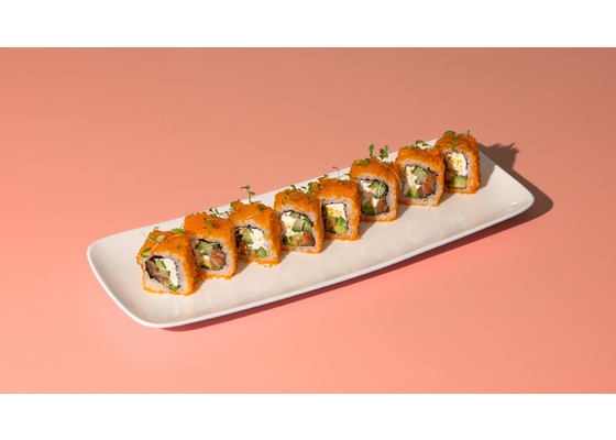 Krējuma siers, lasis, gurķi, avokado, masago, rīsi, nori