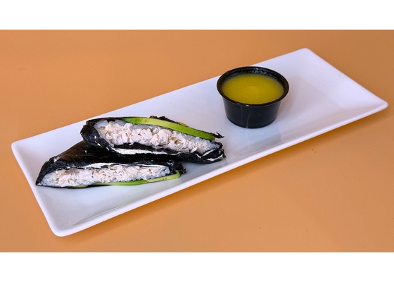 Куриное филе, авокадо, рис, нори, крем-сыр, соус.